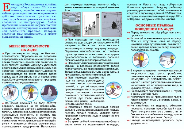 Чрезвычайно опасным является тонкий непрочный лед. Безопасная же толщина льда для одиночного пешехода составляет 7-10 см, для группы людей – 12 см, а для легкового автомобиля – 20-25 см.